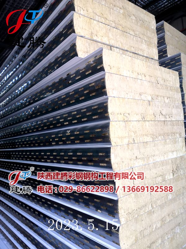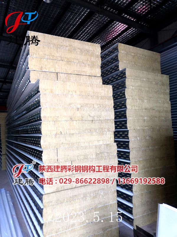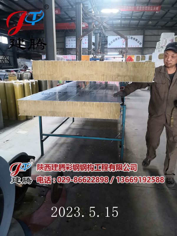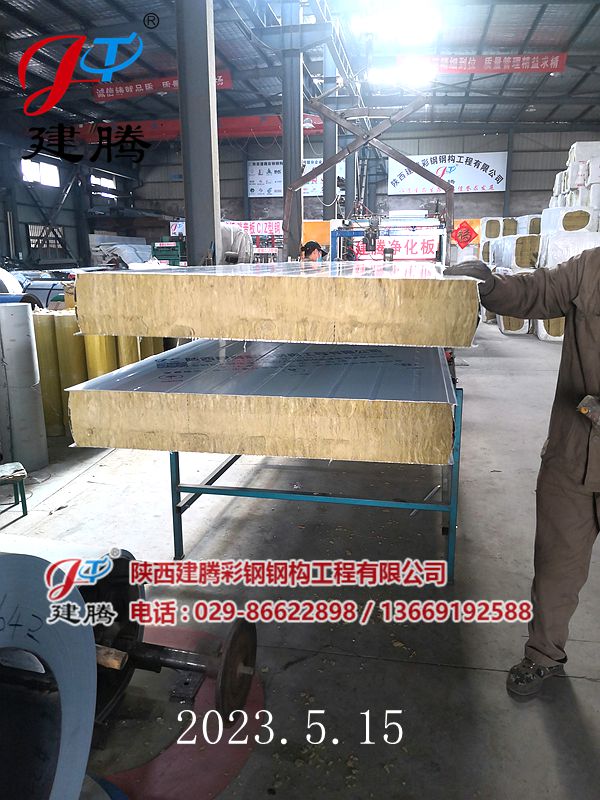 2023.5.16150厚巖棉120公斤容重彩鋼烘道夾芯板裝車中