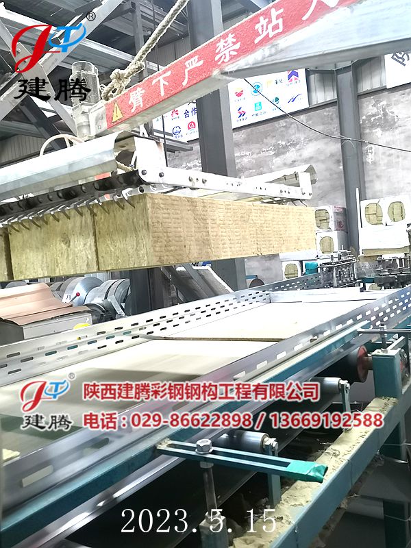 2023.5.15 150厚巖棉120公斤容重彩鋼烘道夾芯板生產(chǎn)中